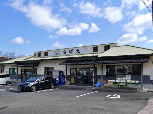 上浦活性化センター しおさいの里の全景です。駐車場は意外と広くて数十台の普通車が停められそうでした。画像には二つの建物が見えていますが、左の建物には「海鮮丸」と書かれていて、奥に見えている建物は物産館のようでした。詳しくは分かりませんが両方の施設を併せて「しおさいの里」と言うんでしょうね?