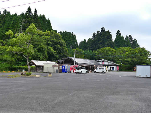 ひぐらし茶屋の全景です。手前の横に長い建物が直売所で、その奥に見える建物は同じ敷地内にある焼肉屋さんです。駐車場は白線がほとんど消えていますが、普通車が数十台は停められそうな広い駐車場です。