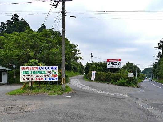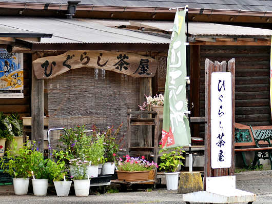 国道442号から県道412号へ分かれて3㎞ほど走ると、県道沿いに「里の駅 ひぐらし茶屋」と書かれた大きな看板が見えてきたので、この日最初に車を停めたのはここです。