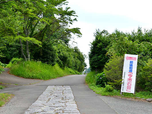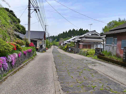 この道路の入口には「肥後街道 今市石畳」と書かれた看板が立っています。ここは江戸時代には肥後・熊本と豊後・鶴崎を結ぶ参勤交代路の肥後(豊後)街道の今市宿があったところで、現在でも当時の石畳が残っていて大切に保存されています。