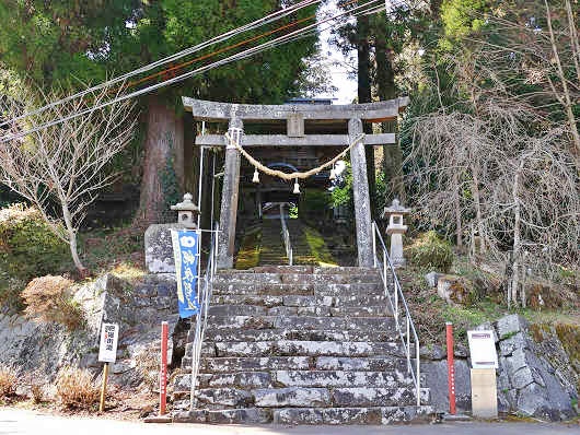 ひぐらし茶屋から今市石畳を目指して進むと、まず見えてくるのが小高い丘の上に鎮座する「丸山神社」です。苔むした長い石段を登った先にある楼門には見事な彫刻が施されていて、秋にはイチョウの落葉で境内一面が黄葉の絨毯に覆われるところなんですよね。
