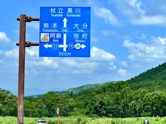 国道442号を熊本県小国町方面へ14㎞ほど走ると、やまなみハイウェイとの交差点に出ます。ここは大分県と熊本県の県境付近で、やまなみハイウェイはここより左側は熊本県道11号、右側は大分県道11号になります。