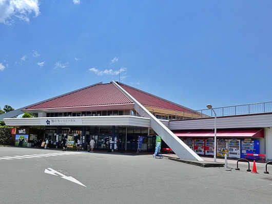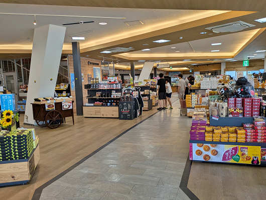 この建物がレストラン、お土産屋さんなどが入っているメインの施設です。建物は2階建てで、24時間利用可能な広いトイレもあって、この右側の敷地内にはガソリンスタンドもあります。