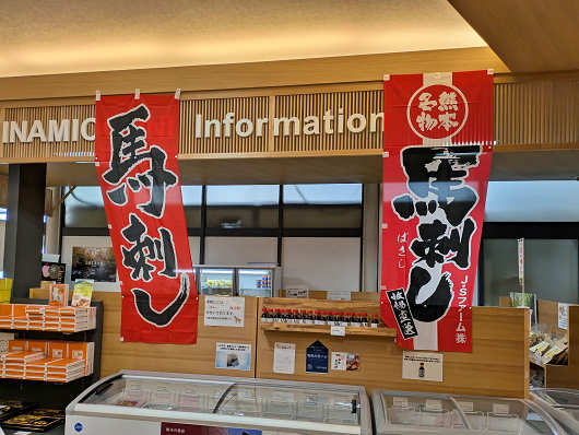 瀬の本レストハウスがあるのは熊本県なので、馬刺しの幟が立てられていて多くの馬肉も売られていました。他県では見られない熊本県ならでは光景ですね。