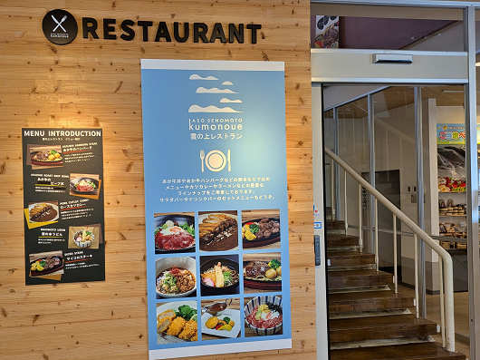 2階はレストランになっていて「雲の上レストラン」と名付けられていました。階段の上り口にはメニュー表も貼られていて、あか牛丼や麺類など様々な料理がいただけるようでした。