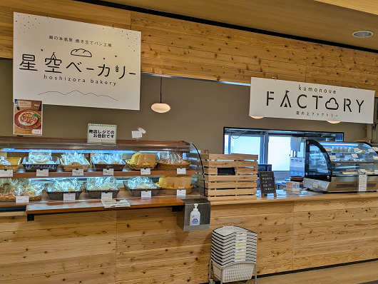そして1階を奥に進むと「星空ベーカリー」というパン屋さんと、「青空デリ」という弁当、総菜のお店がひとつになった「雲の上ファクトリー」というテイクアウトのお店がありました。お店の前はフードコートになっていたので、ここで食べることもできるようでした。