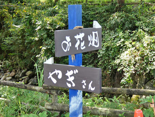 駐車場に車を停めたらまずは周辺を見て廻りました。物産館の裏手にはこの様な案内表示が立てられていて、花畑では秋になると100万本のコスモスが咲き乱れるそうですが、今はまだ時季が早いので、花畑はパスして「やぎさん」と書かれた坂道を登ってみました。