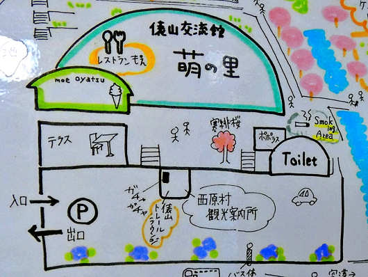 物産館の入口には「俵山交流館 萌の里」の全体案内図が掲示されていましたが、手書きの案内図は温かみがあってがいい感じですね。