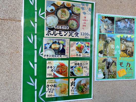物産館内には「レストラン もえ」というお食事処があって、物産館の入口にはメニュー表が貼られていました。これを見ると萌の里特製「ホルモン定食」が一番人気のようですね。