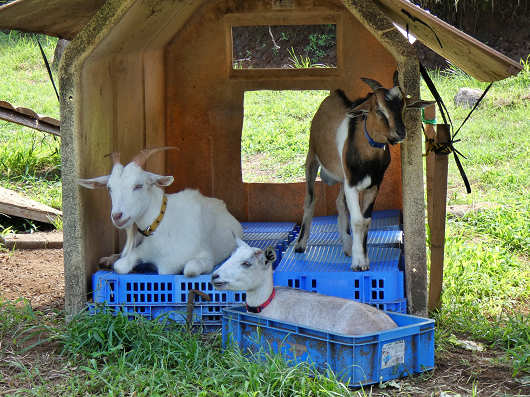 このヤギはとってもおとなしかったので、フェンス際まで行って中を覗いてみると、小屋の中には親子らしき3匹のヤギがいました。コンテナボックスに入った子ヤギが可愛いですね。