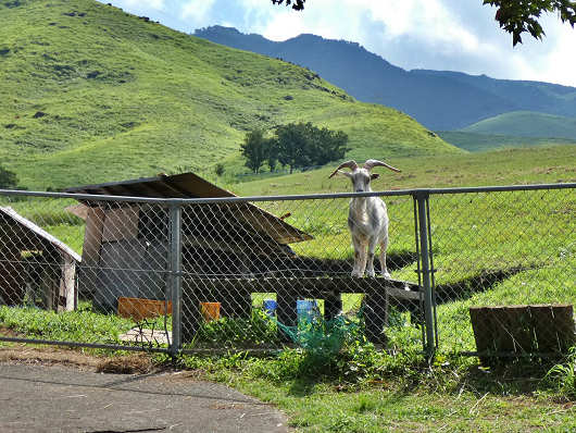 坂道を100mも進むとフェンスに囲まれた緑地のようなところに出て、フェンスの中では見張り台?の上に立った大きな角のヤギが、監視するように身動きもせずにこちらをじっと見ていました。