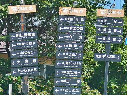 筋湯温泉の旅館街を抜けると、道路沿いにズラリと旅館名が書かれた看板が立てられていました。筋湯温泉に宿泊したことはありませんが、思っていた以上に旅館が多いようですね。