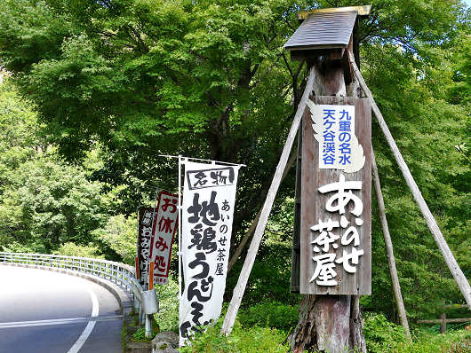 T字路を左折した道は県道40号(ぐるっとくじゅう周遊道路)ですが、途中から広域農道の「四季彩ロード」へと左折して、しばらく下り坂を進んで行くと、道路沿いに「あいのせ茶屋」と書かれた看板が立っていたのでここに車を停めました。