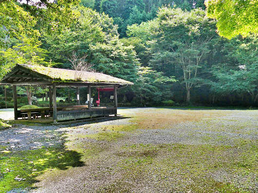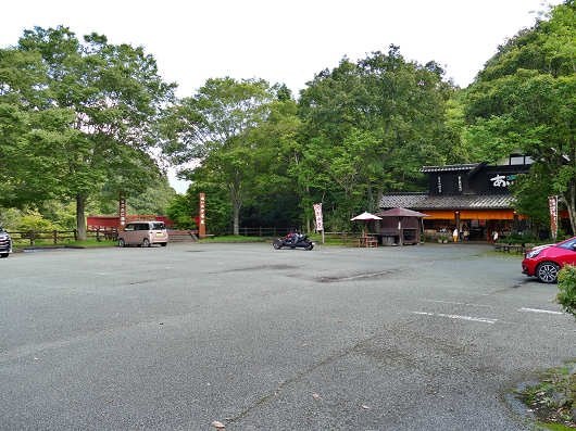 すぐ横には未舗装のさらに広い空き地?があって、両方を合わせるとかなりの車が停められそうでした。画像に写っている建物は飲食・休憩コーナーのような感じで、テーブルなどが置かれていたので、もしかしたらバーベキューなどに利用するのかも知れませんね?