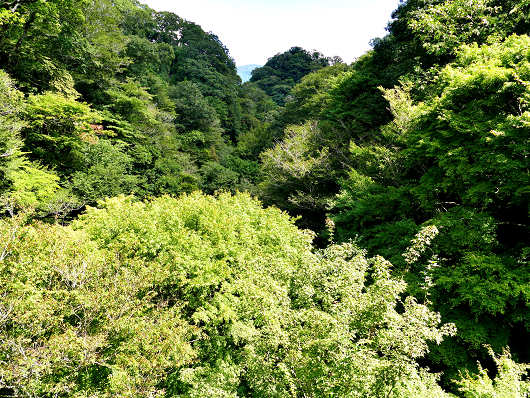 展望所から眺めた景色です。ここは樹木がうっそうと繁っていて、この時季はまだ緑一色でしたが、秋には紅葉がとてもきれいでしょうね。