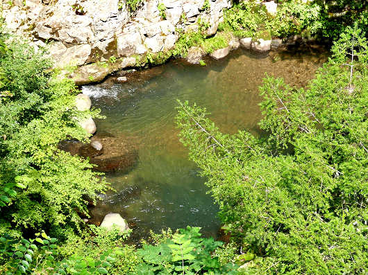 そしてうっそうと繁った木々の間から渓谷を覗いてみると、僅かに川面が見えてきれいな水が流れていました。でも周囲には下へ降りる道は無そうだったので、この暑い季節でも眺めるだけで水遊びをするのは無理なようですね。
