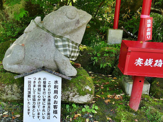 空き地を奥に進むと大きなカエルの石像と賽銭箱などがあって、水汲みをする人に協力金をお願いする看板がありました。