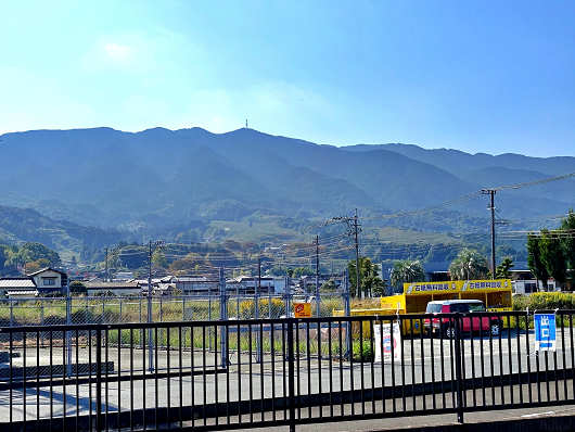 駐車場に車を停めたらまずは敷地内を見て廻りましたが、ここは耳納連山の麓に近いところにあるので、駐車場の端からは耳納連山がこんなに間近に見えました。