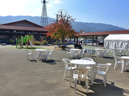 施設は中庭のようになった飲食・休憩スペースを囲むように配置されていて、奥に見える建物が農産物などの直売所で、この左側にはレストランやテイクアウトのお店などがあります。