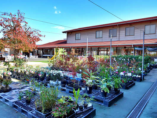 直売所の入口付近にはたくさんの植木や果樹苗なども並べられていました。奥に見える建物にレストランなどが入っています。
