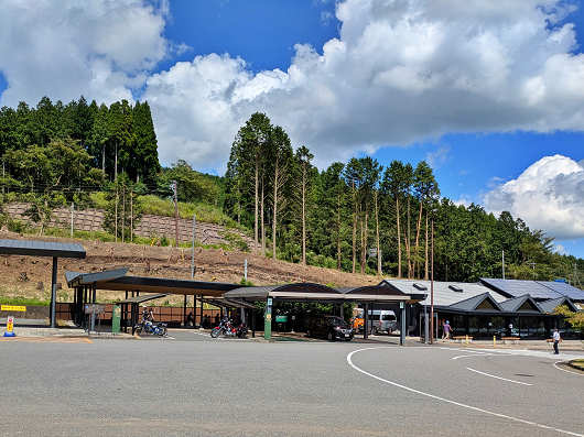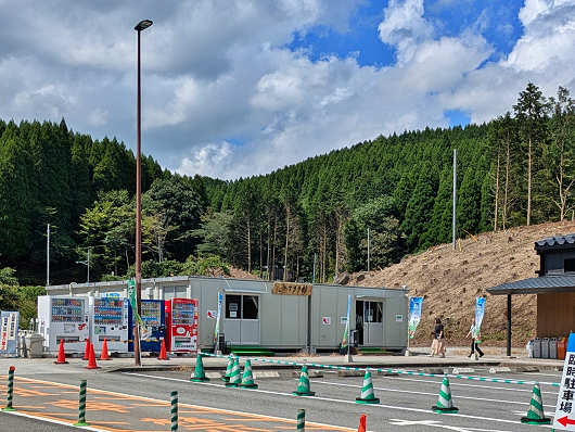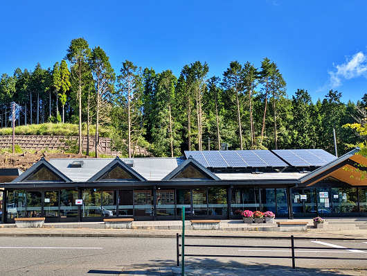 この画像は以前ここを訪れた時に撮影したものですが、リニューアル工事が始まる前は、道の駅の裏手には建物に迫るほど杉の木がうっそうと繁っていたんですよね。まだ建物本体の工事は全く始まっていませんが、これだけバッサリと周辺の樹木を伐採をするってことはかなり大規模なリニューアル工事を行うんでしょうか?