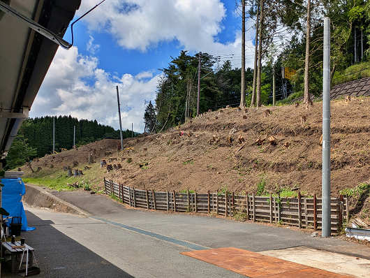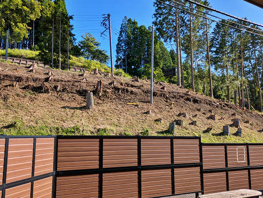 敷地内を見て廻ったら一服してから出発しよと、喫煙スペースへ行って一服しながら何気なく建物の裏手の斜面を見たら、うっそうと繁っていた杉の木がほとんど伐採されていました。