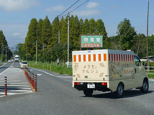 この画像は県道58号から「メタセの杜」へ入る時に対向車が切れるの待っていた時の画像ですが、すぐ前には「メタセのマルシェ」と書かれた車が停まっていました。この車はメタセの杜が実施する過疎地買い物応援プロジェクトで運行している移動販売車です。メタセの杜は民間じゃなくて築上町の第三セクターが運営しているんですよね。