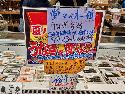 新しくなったお食事処を見たら物産館へも入ってみました。お弁当コーナーでは月間売上数第一位と書かれた「うなぎ弁当」が目に留まったので、お昼ご飯用にお買い上げです。