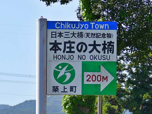 正光寺から県道237号を山に向かって数百mも進むと、道路沿いに日本三大楠(天然記念物)「本庄の大楠」と書かれた標識が見えてくるのでここを右折しました。