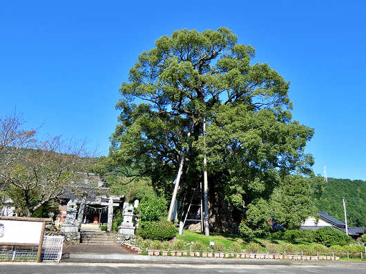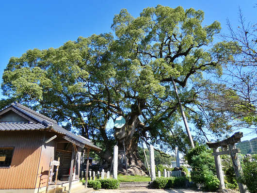 大楠神社の境内から眺めた「本庄の大楠」です。大楠の手前には大楠神社の鳥居と拝殿も見えています。