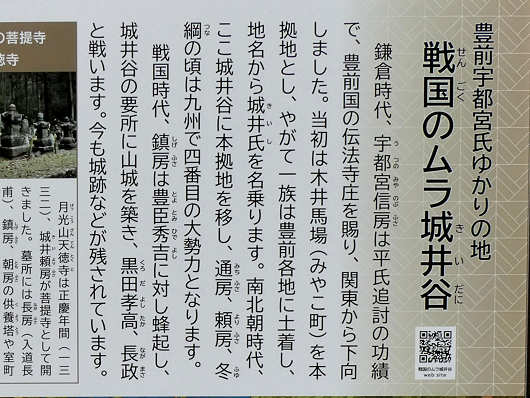 駐車場の一角には「豊前 宇都宮氏ゆかりの地 戦国のムラ城井谷」と書かれた説明板がありました。過去に放送されたNHK大河ドラマ「軍師官兵衛」の中で宇都宮鎮房が登場して地元では話題になりましたが、宇都宮氏の城を攻め落とせなかった中津城主だった黒田官兵衛は、和睦と偽って誘い出した鎮房らを謀殺して宇都宮一族を滅亡させているんですよね。