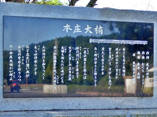 駐車場の奥には比較的新しい石碑があったので見に行ってみると、楽譜の一部や歌詞の他に、作詞、作曲者の名前などが刻まれていたので、この大楠は唄にもなっているようでした。唄になっている大楠(巨木)って聞いた事が無いですね。