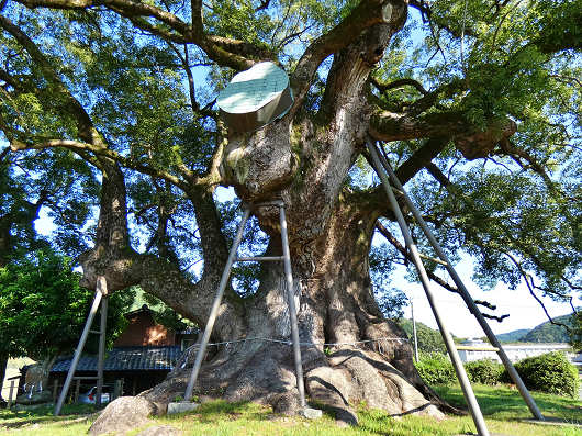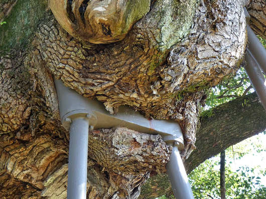 大楠の根元近くまで行ってみると、大きく横に広がった枝の根元は何本もの支柱で支えられていました。