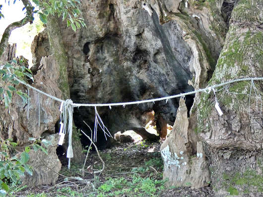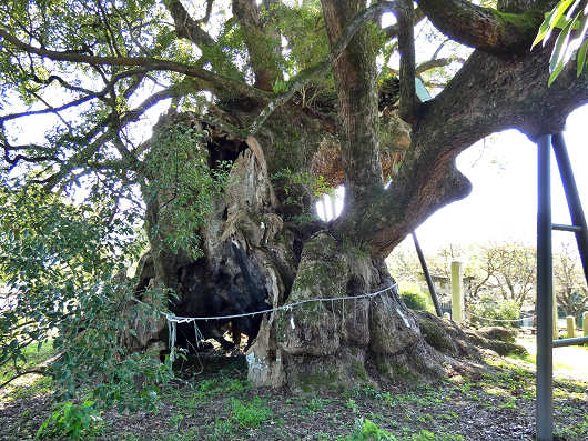 大楠の裏側へ廻ってみると、幹根はポッカリと大きな穴が開いていました。明治34年にはこの中で焚火をしていて樹体の大部分が焼失したそうですが、その後第一枝が蘇って現在の大きさにまで成長したそうです。