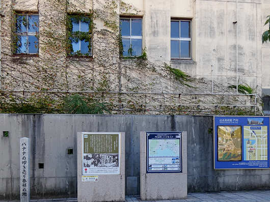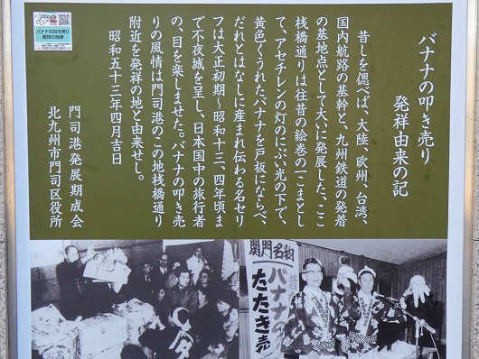石柱の横には「バナナの叩き売り 発祥由来の記」と書かれた説明板がありました。バナナの叩き売りは今では祭りのアトラクションなどでしか見ることができませんが、当時は大量のバナナを台湾から輸入していて、船倉で熟れたバナナを門司港で腐る前に売り切っていたそうです。