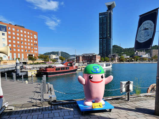 さらに先へ進むと少し奥まったところにある港へ出て、岸壁には北九州市門司区のゆるキャラ「じーも」が立っていました。そして港の奥には31階に「門司港レトロ展望室」がある高層マンションの「レトロ ハイマート」が見えました。この辺りが門司港レトロの中心部のようですね。