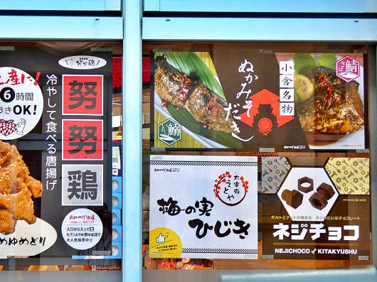 窓ガラスにはこの様なポスターも貼られていました。「努努鶏(ゆめゆめどり)」、「ぬかみそだき」は北九州の名物料理ですね。「ネジチョコ」は初めて聞く名前でしたが、北九州の名物スイーツだそうです。