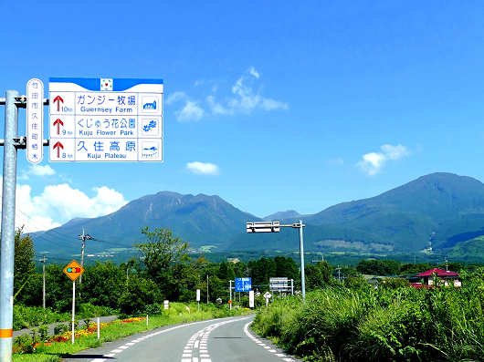 県道412号をしばらく走っていると、前方に雄大な久住の山々が見えてきました。この日はお家を出発した時には雲が広がっていましたが、この頃になる雲も無くなって快晴の天気となりました。この辺りは標高が高いので涼しい風が吹いていますが、平地では今日も猛暑日となりそうですね。