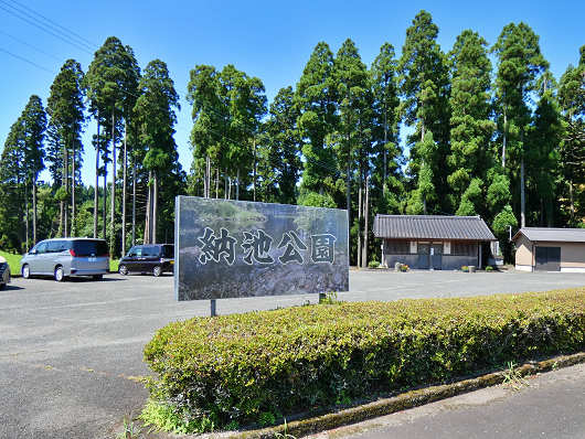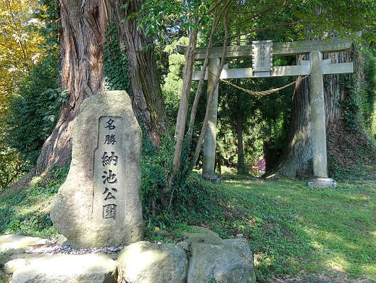 納池公園の入口です。奥には鳥居も見えていますが、ここには「納池神社」も鎮座しているんですよね。そして画像には根元付近だけが写っている杉の巨木の枝ぶりがとても見事なんですよね。