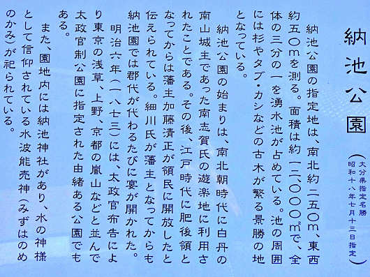 駐車場に立てられていた納池公園の説明書きです。これによると納池公園の始まりは南北朝時代の14世紀にまで遡る由緒ある公園なんですね。そして日本で初めて東京の浅草、上野、京都の嵐山などと並んで太政官制公園に指定されたいうのも凄いですね。