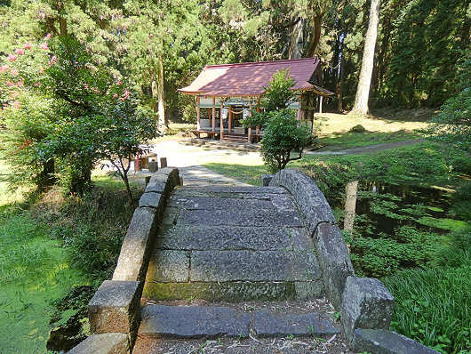 池の畔を歩き始めるとすぐに、石造りの太鼓橋と、その先に小さなお社が見えてきます。