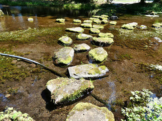 湧水を一口飲んだら、透き通った浅い池にある苔むした飛び石を通って対岸へ渡りました。