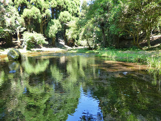 池の周りには池をぐるりと廻るように遊歩道もあって、ゆっくり歩いても10分ほどで廻れるので、まずはどこから水が流れ込んでいるのかと池の最上流部へ行ってみました。最上流部はこの様な細い流れになっていて、最後はその流れも無くなっていました。納池公園には流れ込む川は無くて、水源はまさに久住山の伏流水なんですね。ちなみに納池公園では日量7500㎥の湧水が湧き出しているそうです。