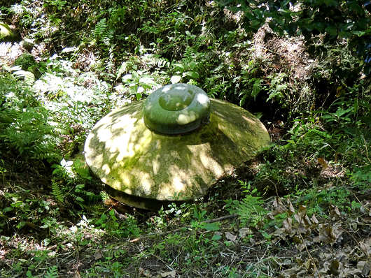 遊歩道を歩いているとUFOのような不思議な形をしたものが置かれていました。周辺には雑草などが繁っていたので近づく事はできませんでしたが、下流に向かって長くて黒いホースが伸びていたので、これは集落で使用する生活用水の水源のようでした。