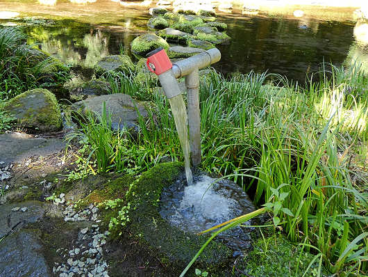 納池公園は名前の通り池を中心とした公園で、お社のすぐ横に立てられたパイプからは久住山の伏流水が勢いよく湧き出していました。お社の掃除をしていたおじさんに話を聞いたら、この水は飲めるとの事だったので、手で掬って口に含んでみたら、とても冷たくてまろやかな感じがする湧水でした。