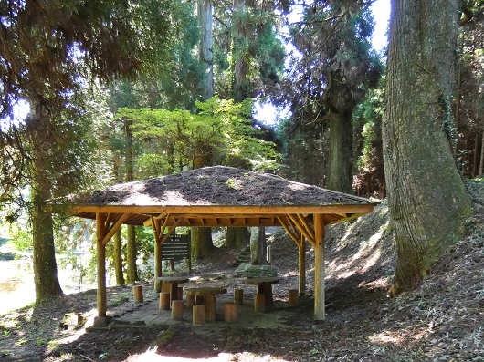 杉やタブ、カシなどの大木が繁った池の畔の林の中にはこの様な休憩所もありました。見るからに涼しげですね。