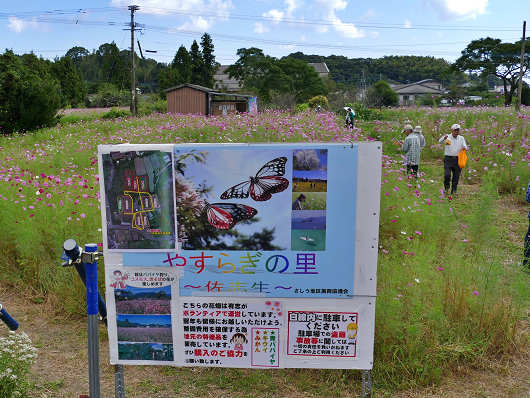 コスモス畑の中には「青パパイヤ販売所」と書かれた幟の立った小屋があります。昨年訪れた時には小屋は無人で販売もしていませんでしたが、今回はこれだけの人が訪れているので販売をしているでしょうね。