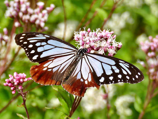 フジバカマといえば渡り蝶のアサギマダラの大好物ですが、畑へ到着する前から何匹ものアサギマダラが頭上を飛び交っていて、フジバカマの畑には10羽近いアサギマダラがいました。