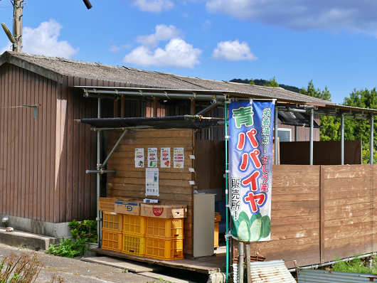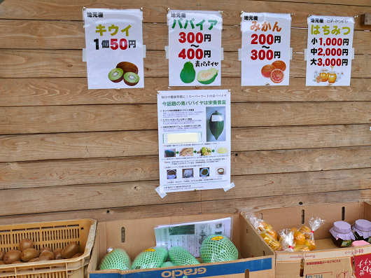 小屋の前では箱に入った青パパイヤ、キウイ、ミカン、はちみつが売られていました。青パパイヤはまだ一度も食べたことが無いので、赤蕎麦の花の観賞を済ませたらここで青パパイヤを買います。