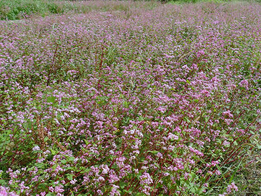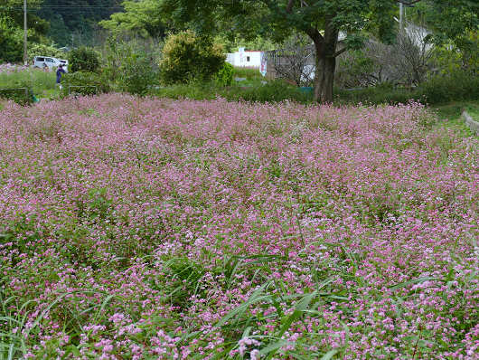 コスモス畑を通り抜けたら赤蕎麦畑があります。今年は台風の被害を受けなかったので、昨年の2倍ほどの面積に赤蕎麦が植えられていて、まさに今が満開って感じでした。